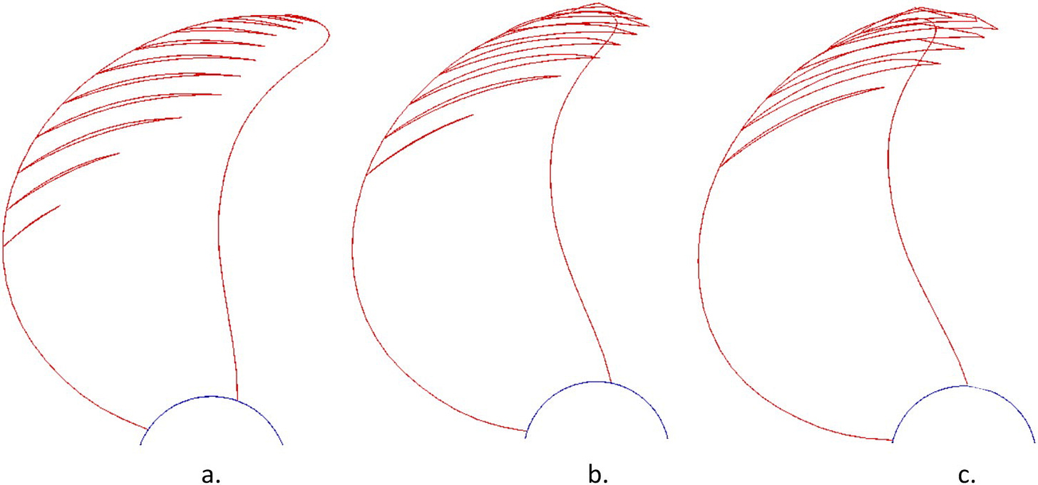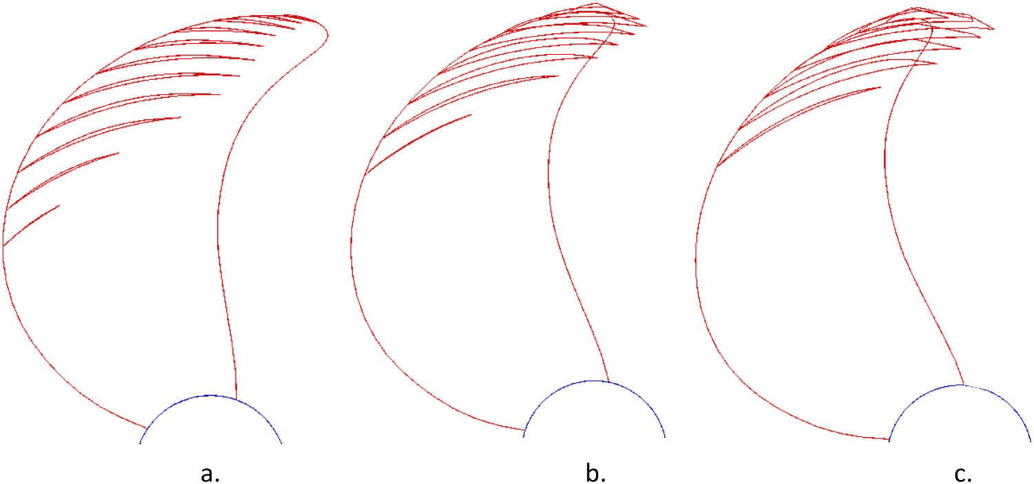 Después de un número preestablecido de generaciones (N), la optimización se detiene y sigue la etapa de evaluación, donde hay dos opciones. Si la población de los diseños individuales es grande, entonces se presenta a los usuarios una parte más pequeña de la población total. Esta parte consta de diseños únicos que se seleccionan al azar de las generaciones totales hasta ese momento. Si la población es pequeña, se presentan todos los diseños. La información que se muestra en la pantalla, en el escenario específico, es la forma de la cavidad que se ha desarrollado en la pala de cada hélice individual, como se muestra en la Figura 2. Tanto para poblaciones pequeñas como grandes de individuos, los usuarios evalúan los diseños en la pantalla rechazándolos o aceptándolos, de acuerdo con sus propias preferencias y experiencia de diseño. En el caso de una población grande, los usuarios evalúan una parte más pequeña de la población total, mientras que se hace una predicción para el resto de los individuos mediante un modelo SVM. Como se mencionó anteriormente, el modelo SVM se utiliza para evitar la fatiga del usuario por tener que evaluar demasiados diseños. Para ambos casos, se rechazan los diseños no satisfactorios.